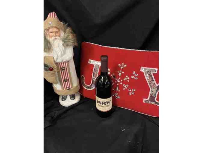 Santa figure, plum island wine, and beautiful red and sequin JOY pillow!