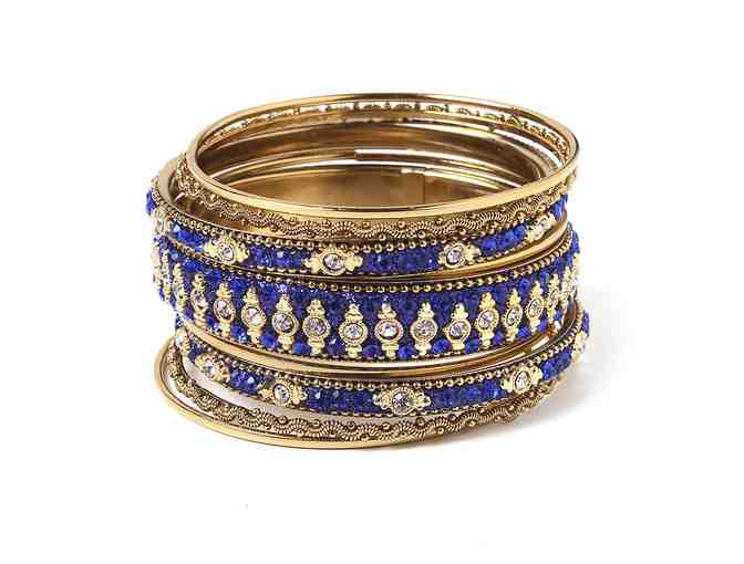 The Glitzy Bangle Set includes a 9-piece, mix-and-match set of beautifully engraved gold-tone brass and Austrian crystal encrusted bracelets for that extra sparkle. Each individual bangle in this set has its own unique characters and details. Pair them up or wear them on their own, either way you're sure to shine bright this holiday season!