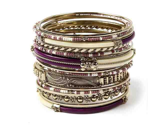 The Monte Carlo Bangle Set includes an 18-piece, mix-and-match set of beautifully engraved gold-tone brass and purple-colored resin beaded bracelets. Each individual bangle in this set has its own unique characters and details. Pair them up or wear them on their own, either way you’re sure to turn heads in these bangles!