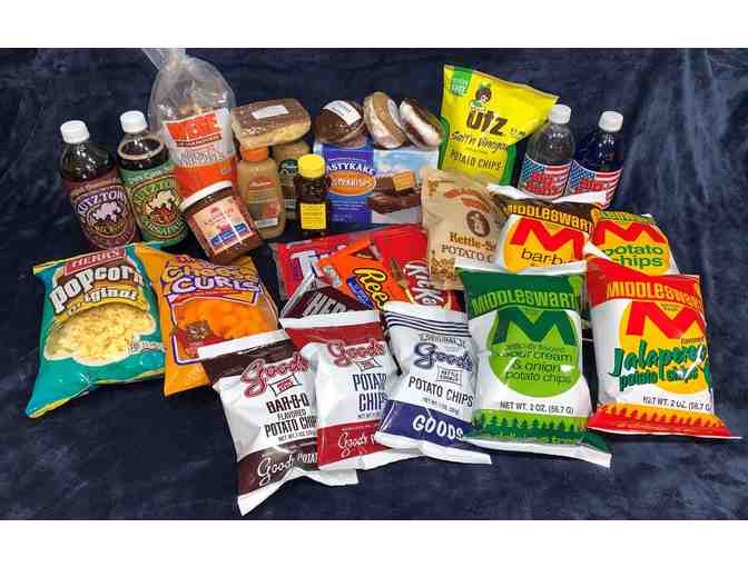 Contents: Kutztown Sarsaparilla soda Kutztown Black Cherry soda Big Bens white birch beer soda Big Bens blue birch beer soda (4) Assorted Middleswarth chips (3) Assorted Goods chips (2) Assorted Utz chips (2) Herrs snacks 1lb Hanover broke pretzels Fishers Sweet Mustard Fishers Horseradish Mustard Local Wildflower Honey Kauffmans Apple Butter Twizzlers KitKat bar Reeses bar Hersheys bar Tastykake Tastykrisps (3) Amish made Whoopie Pies (1) Amish made