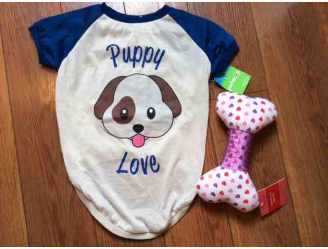 Size large Puppy Love t-shirt by Petmoji. Measures 19 inches long from neck to bottom. Includes a 9 inch plush bone chew toy.