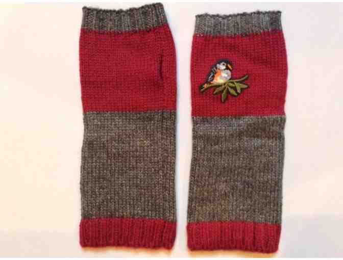 Super comfy fingerless gloves, also known as pulse warmers. People living in the colder mountainous areas of Europe have used them for centuries. By warming the arteries in your wrists, fingerless gloves or pulse warmers, assist in keeping your whole body warmer. Gray and wine knit with embroidered birds on front side. Picture is of front and back.