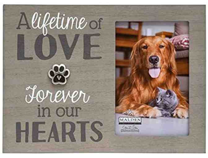 Memorialize your best friend. This memorial pet photo frame features a heartwarming sentiment and a silver paw print attachment. It is designed to match any décor with a tasteful and rustic style. This wood picture frame is crafted to be hung on a wall or displayed standing up using the attached easel back. ItÂs a great way to remember for your furry friend and makes a heartfelt gift for anyone suffering from the loss of a cherished companion. Measures 9 x 7.5 inches. Fits a 4 x 6 inch picture.