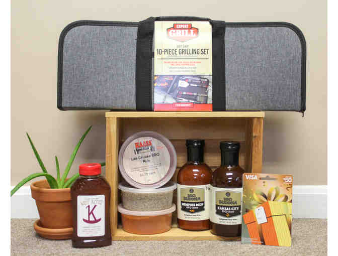 This basket contains local BBQ rubs and honey, along with a 10-piece grilling set, BBQ sauces, and a $50 Visa gift card.