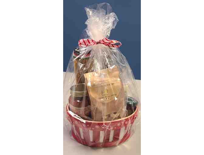 Gabby's gift basket with bottle of 2018 Castello Trebbio Chianti red wine, DiStasi Marinara Sauce jar, jar of marinated olives, 2 mini tiramisu treats, spaghetti and bag of Tarallini.