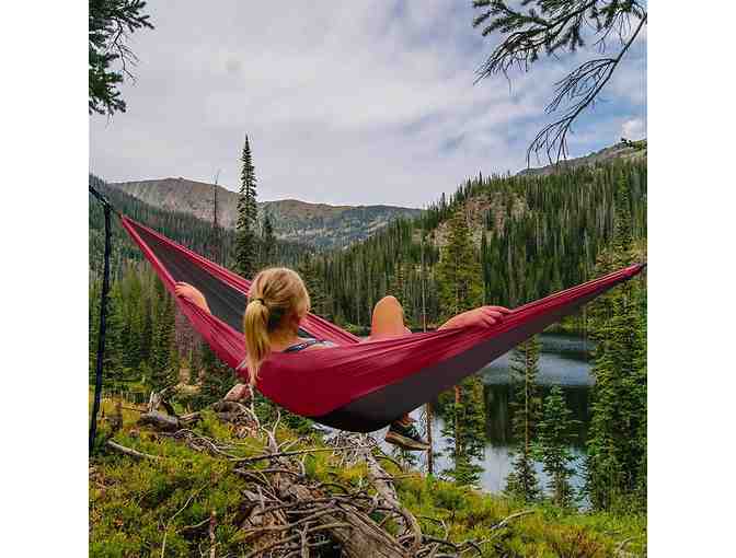 Two Extremus single body sling camping hammocks, red/charcoal. Light and strong high tenacity parachute nylon, dries quickly, 2-10ft long tree straps, carry pocket, heavy duty carabiners, and TPU Pillow.