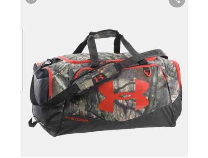 UA Storm gear uses a DWR finish to repel water. Adjustable, padded, HeatGear shoulder strap, 2 large vented end pockets, 1 expandable for laundry and shoes. Large front zippered organization pocket. Top grab handle.