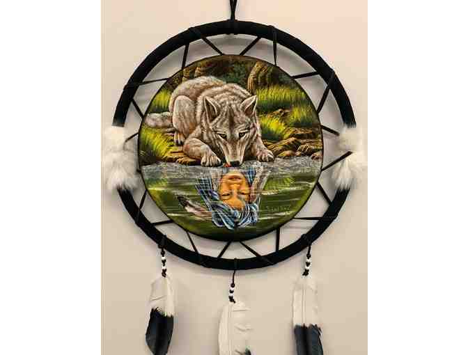 Revel in the significance of this beautifully hand painted dream catcher of wolf reflecting the human spirit. Courtesy of Hangtown Originals.