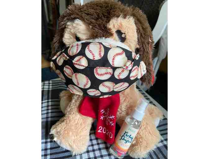 Our sweet pandemic pup comes in his own 31 keepsake gifting bag. Includes a child sized mask by Karen Henshaw, and a spray hand sanitizer by Perfectly Posh.