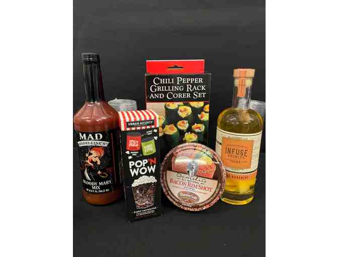 Add a little spice in your life with this package of libations and snacks. Fix some kickin' drinks with a bottle of Mango Habanero Vodka and Bloody Mary Mix. Then pop up some spicy popcorn topped off with Sriracha or Chili Lime seasonings. Go all out and prepare stuffed jalapeno peppers in the Chili Pepper Grilling Rack and Corer Set that is included. Courtesy of Liz Drummond.