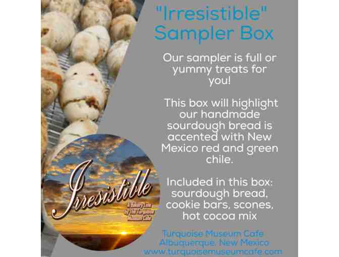 The "Irresistible" sampler box from the Turquoise Museum Cafe is sure to thrill with the rich flavors from savory to sweet! All items are freshly made in our bakery from scratch. This box includes 2 loaves of sourdough bread, accented with NM green and red chile. 2 assorted cookie bars, 2 assorted scones and a bag of our specialty hot cocoa mix. Box will be shipped to you on your chosen shopping day.