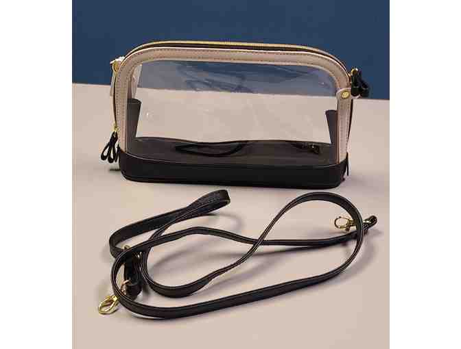 From stadiums to everyday adventures, this clear purse is ideal for carrying around your essentials. The trendy cream 'leather' trimmed bag features a clear body and adjustable crossbody strap.