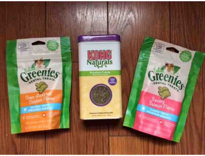 KONG Naturals Premium Catnip is North American grown catnip of the highest quality. KONG catnip is harvested at the peak of its flavor, color and fragrance and field-dried. KONGs premium leaf and flower cut gives you minimal stems and seeds and more of the essential oils that cause a reaction in most cats. 2 ounces in a tin with a toy inside. Two 2.1 ounce packages of Greenies feline dental treats in the flavors of oven roasted chicken and salmon.
