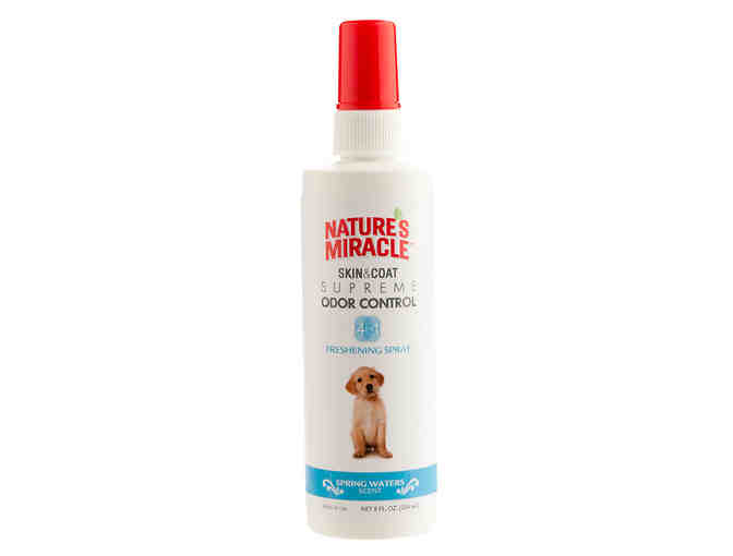 When strong dog odors start to crinkle your nose, it's time for Nature's Miracle Skin & Coat Freshening Spray with Supreme Odor Control. The 4-in-1 formula neutralizes odors, deodorizes, freshens and conditions your dog's coat. This spray neutralizes a wide variety of odors on-contact by forming an odor control complex. It's effective for long-term odor control, and freshens your pup with a light spring waters scent you and your family will appreciate. Alcohol and soap free formula. Contains no dyes or parabens. 8 ounces.