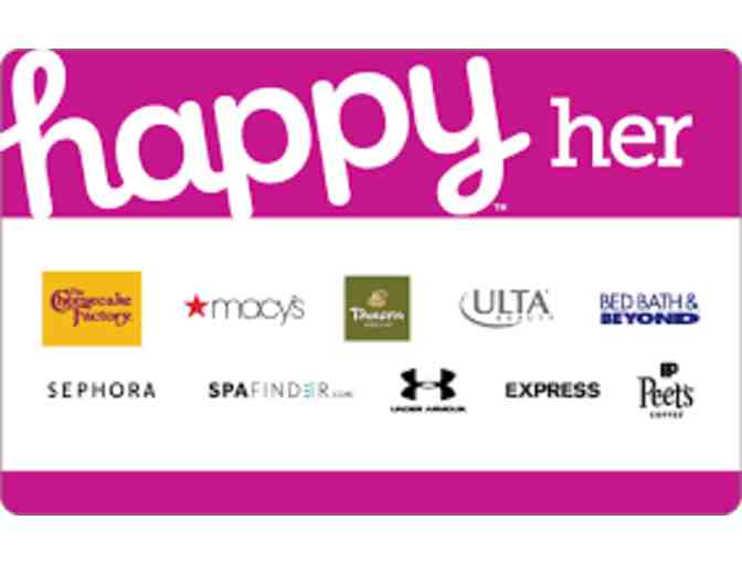 $25 "Happy Her" gift card to multiple merchants including The Cheesecake Factory, Macy's, Panera Bread, Sephora, SpaFinder, Ulta Beauty, Bed, Bath & Beyond, Under Armour, Express, and Peet's Coffee.
