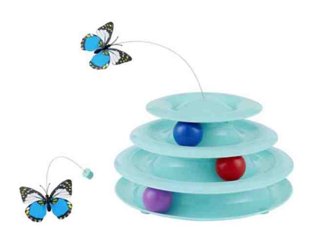 These tracks have everything cats love—a ball to bat and chase around the tracks, the excitement of the rolling sound, and even a fluttery butterfly on top! There are three levels for even more play, each with its own rolling ball, so even more than one kitty can get in on the fun. Go ahead, let them go wild. The nonskid pads keep the track from sliding around when playtime goes into overtime.