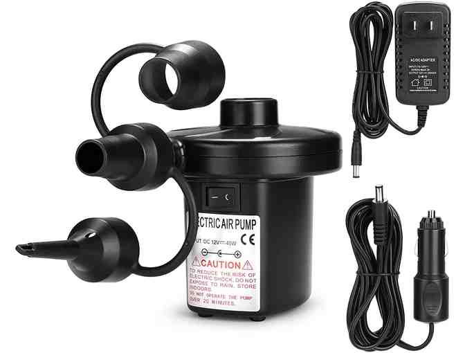 This powerful air pumps can not only inflate but also deflate items by sucking air out. Each inflatable mattress pump comes with 3 nozzles of different size, allowing you to inflate and deflate items in short time. It’s small, lightweight and easy to use. Car power adapter and home power adapter are also included in the inflatable mattress pump.