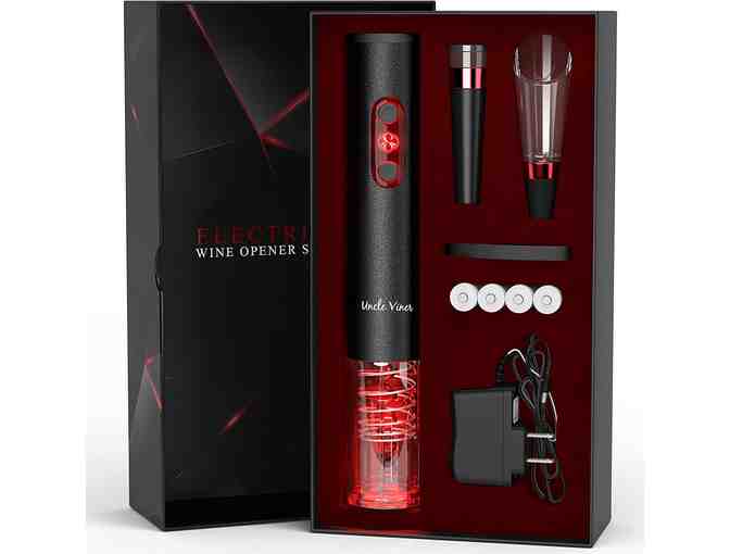 Electric Wine Opener opens a wine bottle in 7 seconds. Easy and fast to use, up to 80 bottles can be opened in one full charge by this must have kitchen gadget. Wine Opener gift kit includes 4AA batteries (NiMh), Automatic Rechargeable Corkscrew, Foil Cutter, Wine Pourer, Vacuum Wine Stopper, Charger, Manual.