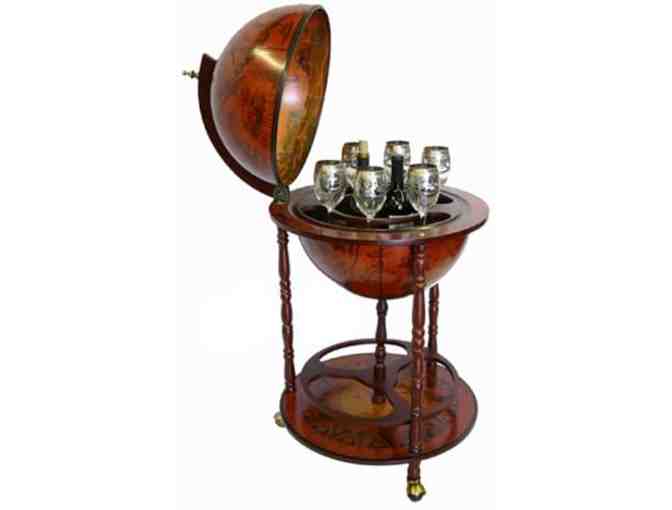This charming Sixteenth-Century Italian Replica Old World Bar Globe come ins brown hardwood, size: 22.5 x 22.5 x 13.5 inches.