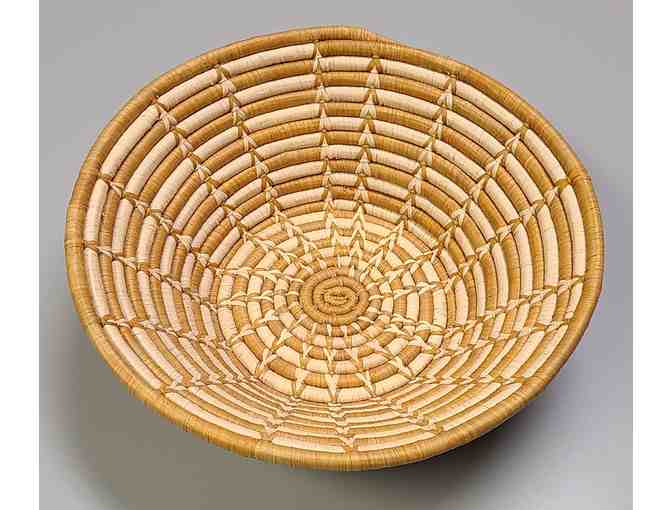 Handmade woven basket in natural and cream. Approximately 13" and has loop on back for wall hanging.