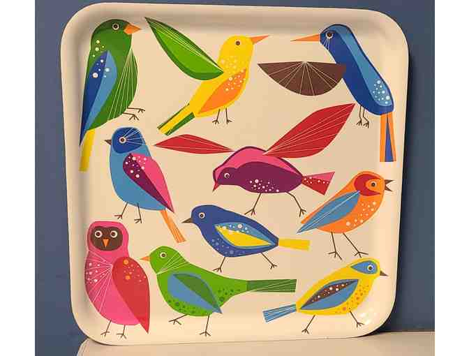 IKEA bird theme melamine tray with angled edges; 13" x 13". Set of 8 matching translucent plastic placemats; 11.25" x 14". (Placemats are no longer available in-store or online.)