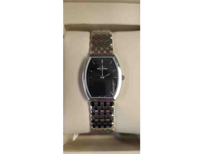 Tavannes Swiss-made Ladies Watch. Thinline dress stainless steel watch and bracelet with black dial.