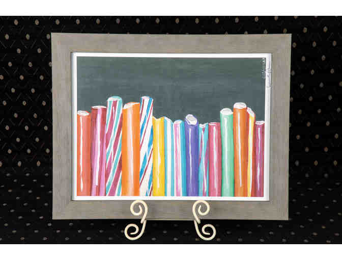 This is a digital print scanned from an original painting in oil. Don’t these look yummy? Multiple flavors in bright colors show off these hard candy sticks, on a neutral grey background.