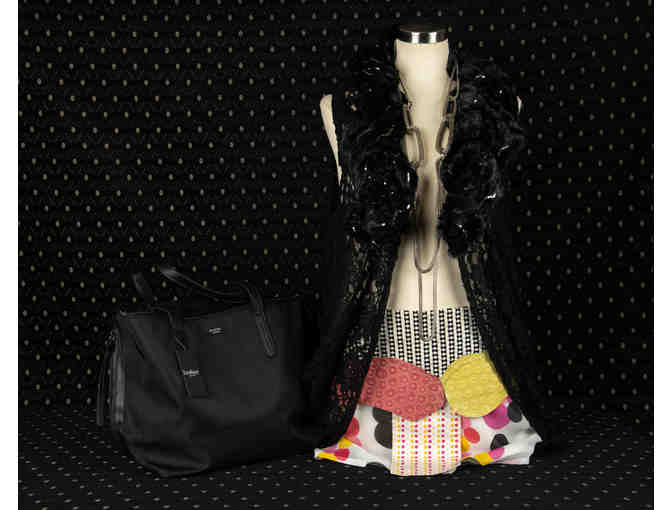 You'll be a walking work of art in this one-of-a-kind, handmade skirt by Frankie Slaughter. Paired with a Botkier tote and a variety of unique acessories, this is an outfit to be remembered.