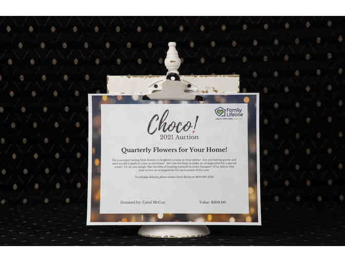Do you enjoy having fresh flowers to brighten a room or your spirits? Are you having guests and want to add a spark of color to the house? Are you too busy to make an arrangement for a special event? Or do you simply like the idea of treating yourself to a nice bouquet? If so, bid on this item to win an arrangement for each season of the year.
