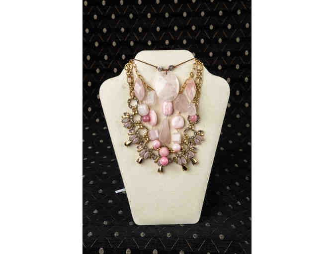 3 unique necklaces - wear together or layer for dramatic impact! Gold and pink stone necklace. Pink stone on leather and a pink J Crew statement necklace!