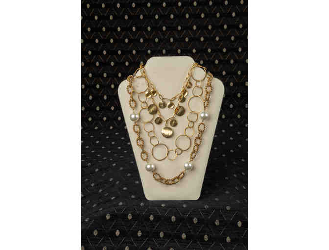 Sparkle in gold with these three necklaces - wear independently or layer for a high fashion look. Large pearl and chain necklace, Gold with bangles and a delicate free form circle necklace.