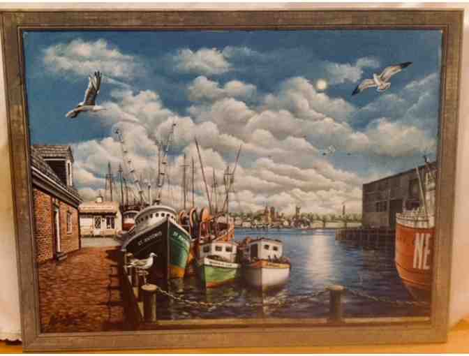 This heirloom 51" x 41" oil painting of the New Bedford waterfront by the artist A. Victor Augusto can be yours to cherish.