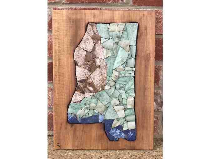 This beautiful reclaimed art by Deb Cole is titled "Mississippi". This piece is created from reclaimed wood along with reclaimed Peter's and McCarty's pottery. The different regions of the state (Delta, Timberlands & Coastal) are reflected in the placement of the pottery pieces. The art measures 12x16.