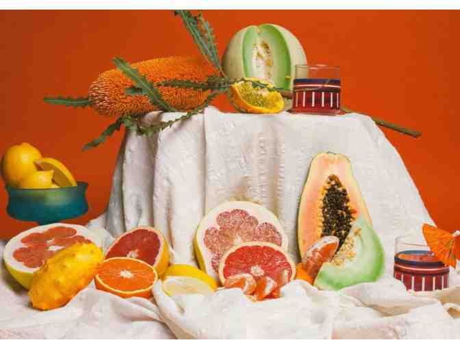 Inspired by the quintessential, and dare we say, suggestive, art-class still life of our dreams. Savor this one slowly as the pieces come together. Saturated color? Ripe fruit? A cocktail wearing a tiny parasol? If only real life looked this pretty.