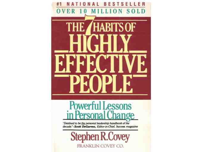 from the cover: "In The 7 Habits of Highly Effective People, author Stephen R. Covey presents a holistic, integrated, princi;le-centered approach for solving personal and professional problems. With penetrating insights and pointed anecdotes, Covey reveals a step-by-step pathway for living with fairness, integrity, honesty, and homan dignity- principles that give us the security to adapt to change and the wisdom and power to take advantae of the opportunities that change creates."