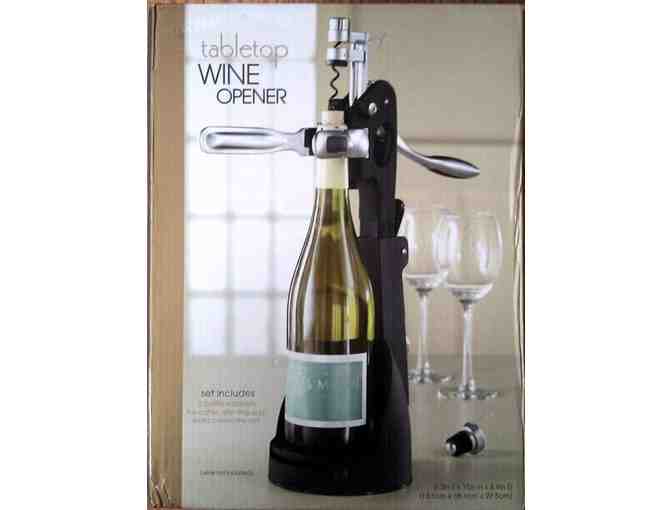 Tabletop Wine Opener, includes 2 bottle stoppers, foil cutter, drip ring, and extra corkscrew coil.