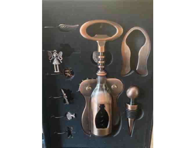 Wine bottle opener, bottle stopper, and those charms to identify your guests’ wine goblets. All you need is the wine!