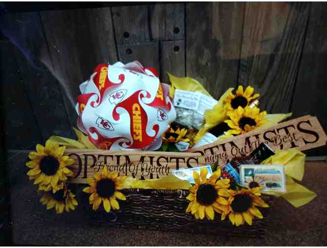 Beautiful Basket of items from Kansas/Kansas City.  Basket includes KC Chiefs Hanging lamp, Bottle of Chardonnay from Mount Eden Vineyards, Optimist Bringing out the Best Placque, Sunflowers, Gates BBQ Sauce, locally made Kansas handwoven basket, "Pumped Up" red slippers and miscellaneous Kansas items.