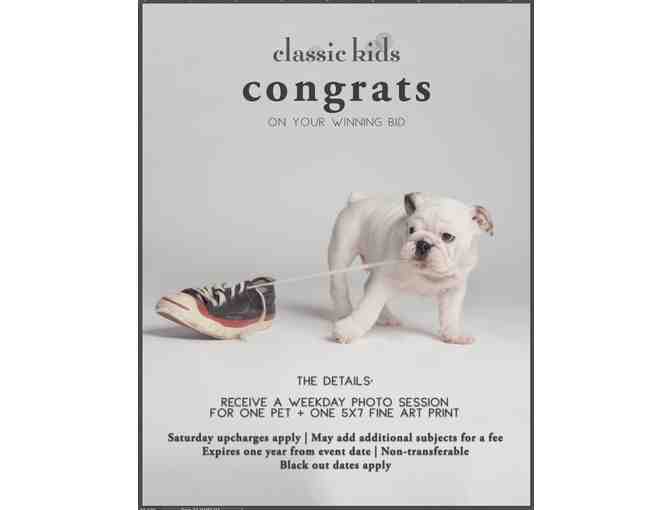 A pet photo session for up to two subjects and includes an 8x10 fine art print!