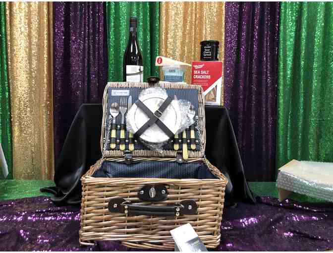 WICKER PICNIC BASKET WITH DISHES SILVERWARE AND CUPS FOR 2.