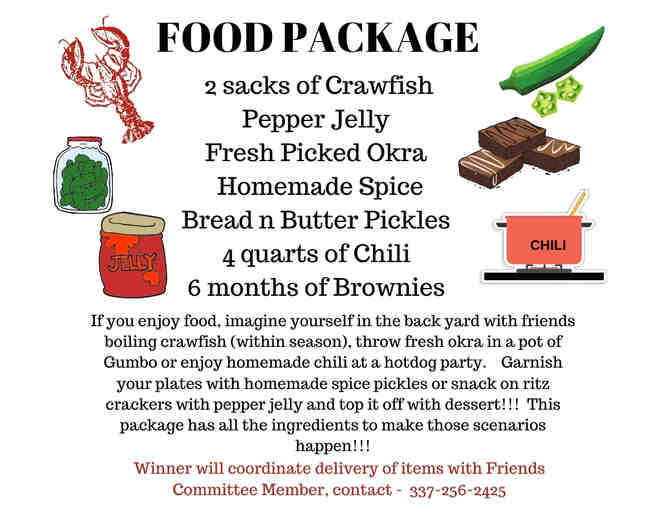 In you enjoy food, imagine yourself in the back yard with friends boiling crfawfish (within season), throw some fresh okra in a pot of Gumbo or enjoy homemade chili at a hotdog party. Garnish your pates with homemade spicy bread n butter pickles or snack on a Ritz cracker with pepper jelly and top it off with dessert!!! This package has all the ingredients to make those scenarios happen. Package includes: 2 sacks of crawfish, pepper jelly, fresh picked okra, homemade spicy bread n butter pickles, 4 quarts of homemade chili and 6 months of brownies!!