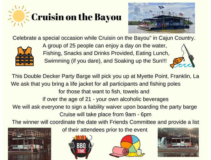 This double decker party barge will pick you up at Myette Point, Franklin, LA. We ask that you bring a life jacket for all participants, fishing poles for those who want to fish, towels and if over the age of 21 - your own alcoholic beverages. We will ask everyone to sign a liability waiver upon boarding the party barge. Cruise will take place from 9am - 6pm. The winner will coordinate the date with Friends Committee and provide a list of their attendees prior to the event.