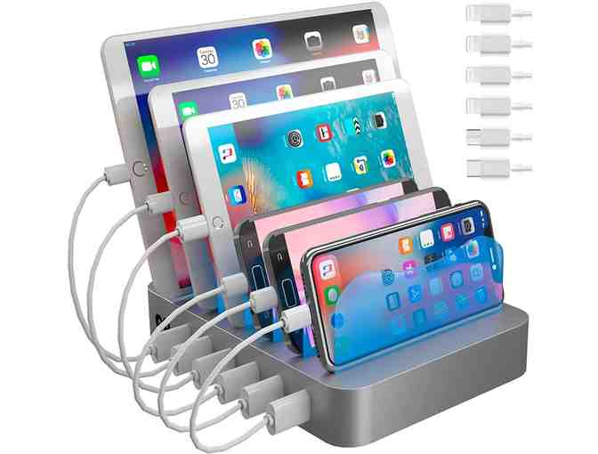 Hercules Tuff Charging Station for multiple devices, with 6 USB fast ports and 6 short mixed USB cables included for cell phones, smart phones, tablets, and other electronics, silver.