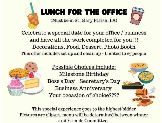 Celebrate a special date for your office / business and have all the work completed for you!!! Decorations, Food, Dessert, Photo Booth - This offer include set up and clean up - Limited to 25 people - Must be in St. Mary Parish, LA