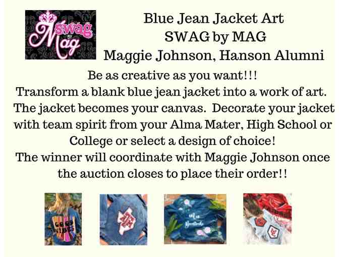 Transform a blank blue jean jacket into a work a of art! Be as creative as you want! The jacket becomes your canvas! Decorate your jacket with team spirit from your Alma Mater, high school or college OR select a design of choice!