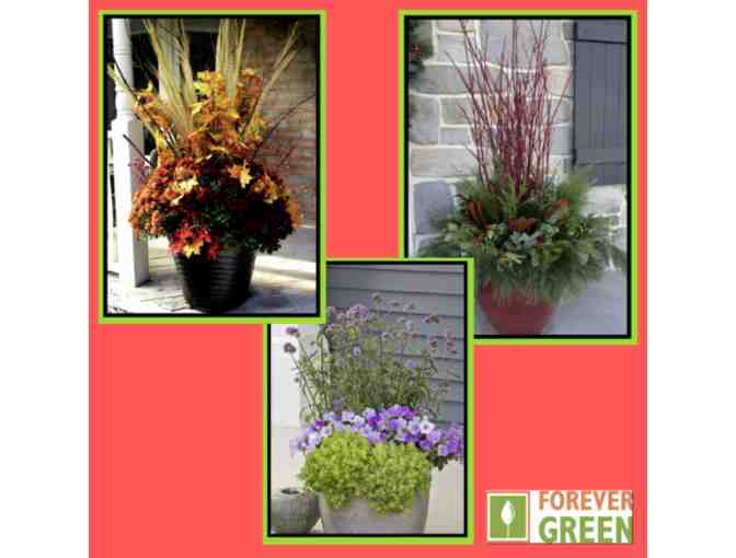 Brighten your home or business with a beautiful planter created just for you by Forever Green. Your three seasonal designs (spring, fall and winter) will add beauty, character and interest to your space. The best part is the work is done for you! Choose your own plants, or leave the design to the pros at Forever Green. Your planter will be magically transformed for each season and will look great for months on end!