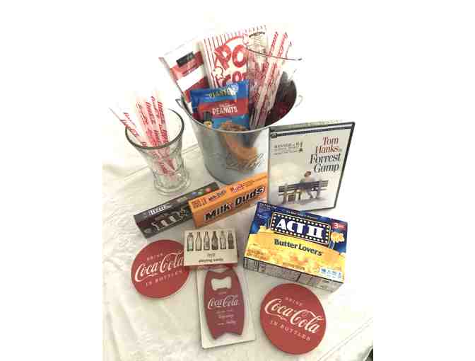 A great collection of items to have a wonderful home movie night....Coca Cola style. Basket includes; Coca Cola Tin Bucket, Forrest Gump DVD, 2 Coasters, Coca Cola items(Magnet Bottle Opener, Glasses, Straws), Napkins, Snacks, Wrapping.