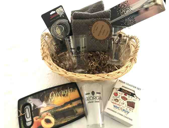 Have some fun with this great gift basket that includes; Set of 4 Coasters, Drink Stainer, Bar Towels, Cocktail Spoon Stirrer, Cutting Board, 4 Drink Local Glasses, Basket, Wrapping