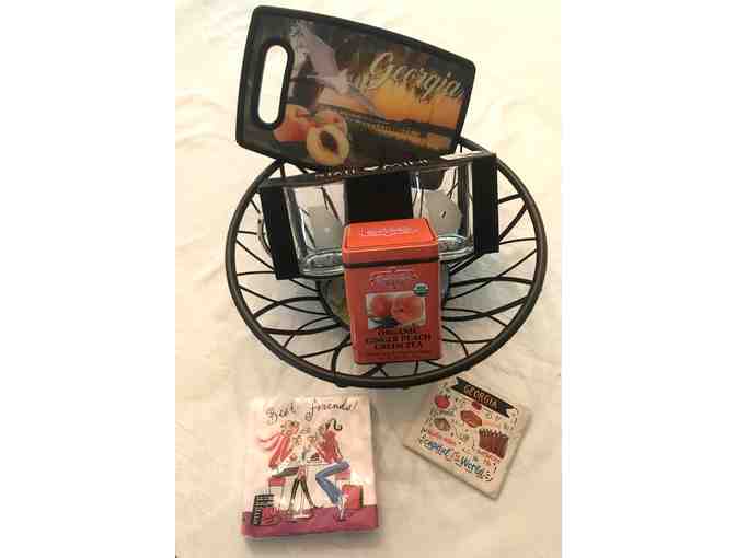 Share this creative and fun gift basket with your BFF. Basket includes; Cutting Board with a Georgia Motif, Glass Mug set - Georgia Etched, Ginger Peach Tea Tin, Best Friends Napkins, Wrought Iron Fruit Basket, Georgia Coaster, Wrapping.