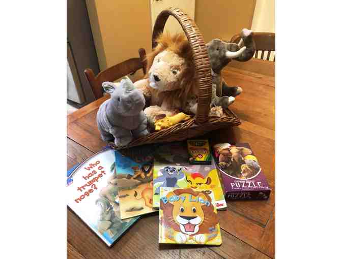 This charming collection of plush toy animals includes an adorable lion father and his lion cub, a gray plush rhino on alert and a magnificent plush toy elephant, ready to charm any child all in a very attractive large wicker basket. The collection also includes a wildlife puzzle, a coloring book Wild Ones crayons and the books, Squash the Lion, Baby Lion and Who Has A Trumpet Nose, an adventure for any young child.